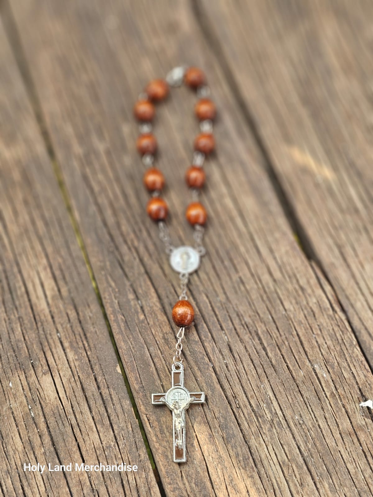 Christian Car Rosary • Rear View Mirror Cross Charm • 10 Beads Wooden Rosary with St. Benedict Medal • Car Accessories & Christian Gifts
