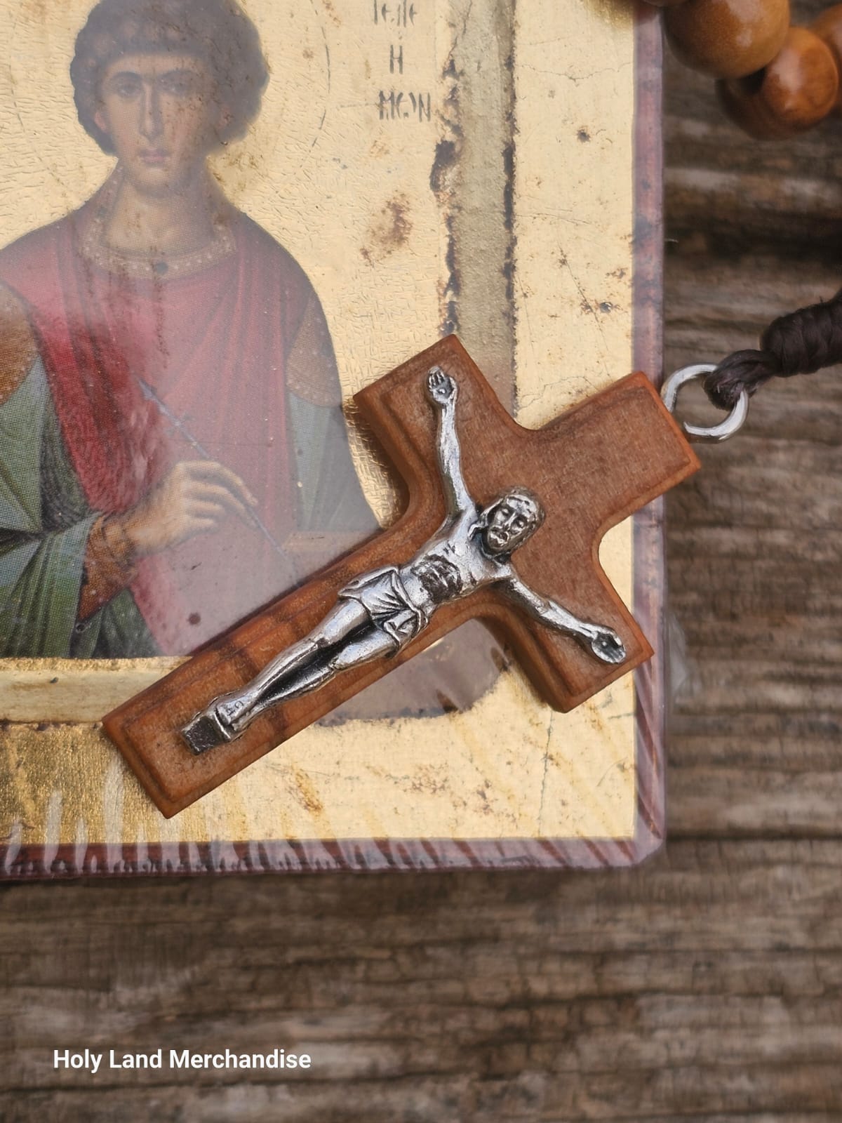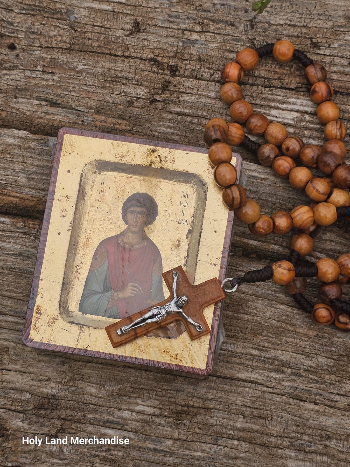 The set also includes a small wooden icon of St. Panteleimon, the great martyr and healer: