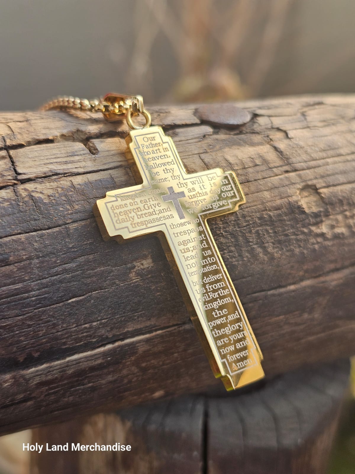Elegant gold cross necklace featuring the engraved text of The Lord’s Prayer on the front.
