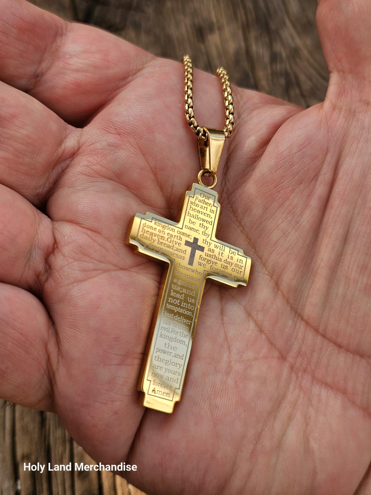 Men’s gold cross necklace – 60cm Chain, 6cm Cross – Stainless Steel Faith Jewelry – Lord’s Prayer