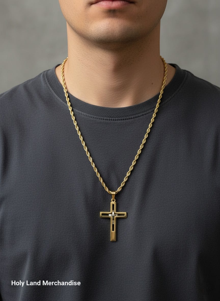 The cross measures 5 cm (2″) and hangs from a 60 cm (24″) durable stainless steel chain, designed for everyday wear and long-lasting shine.