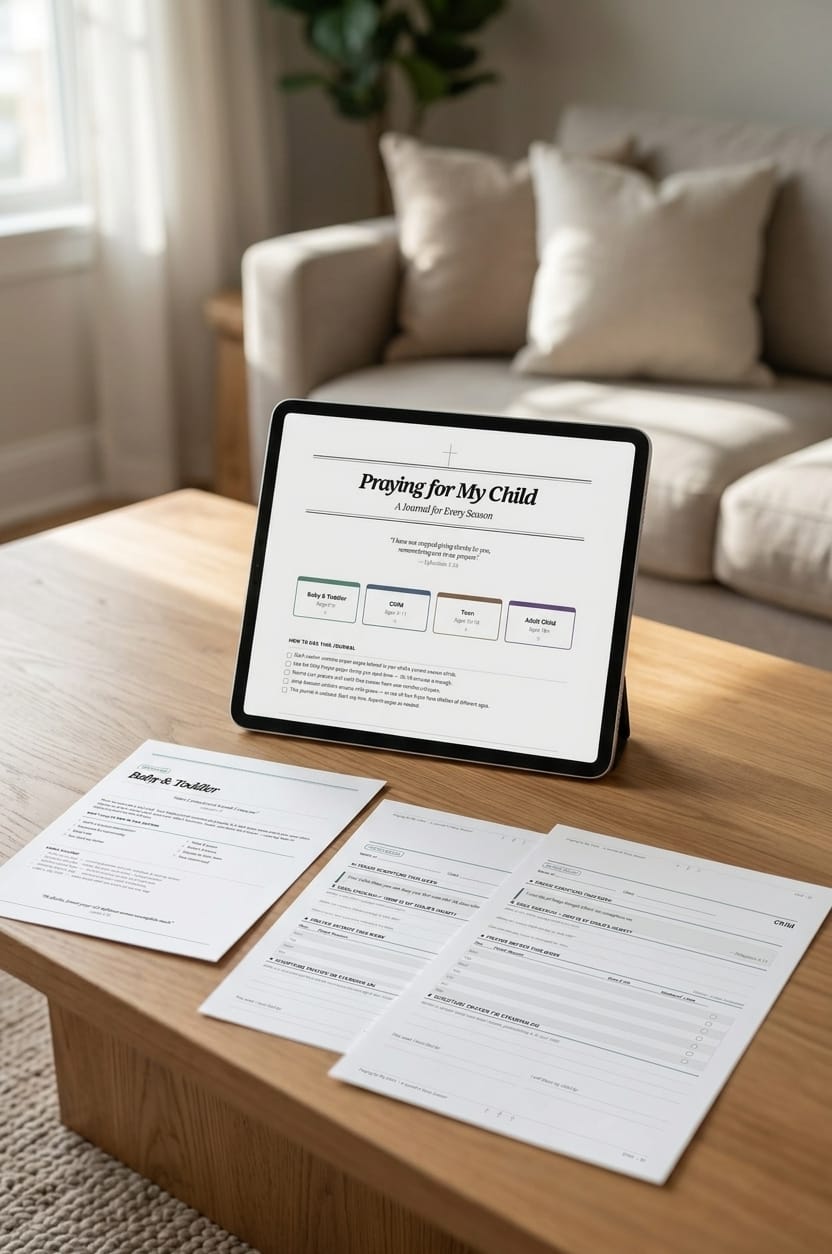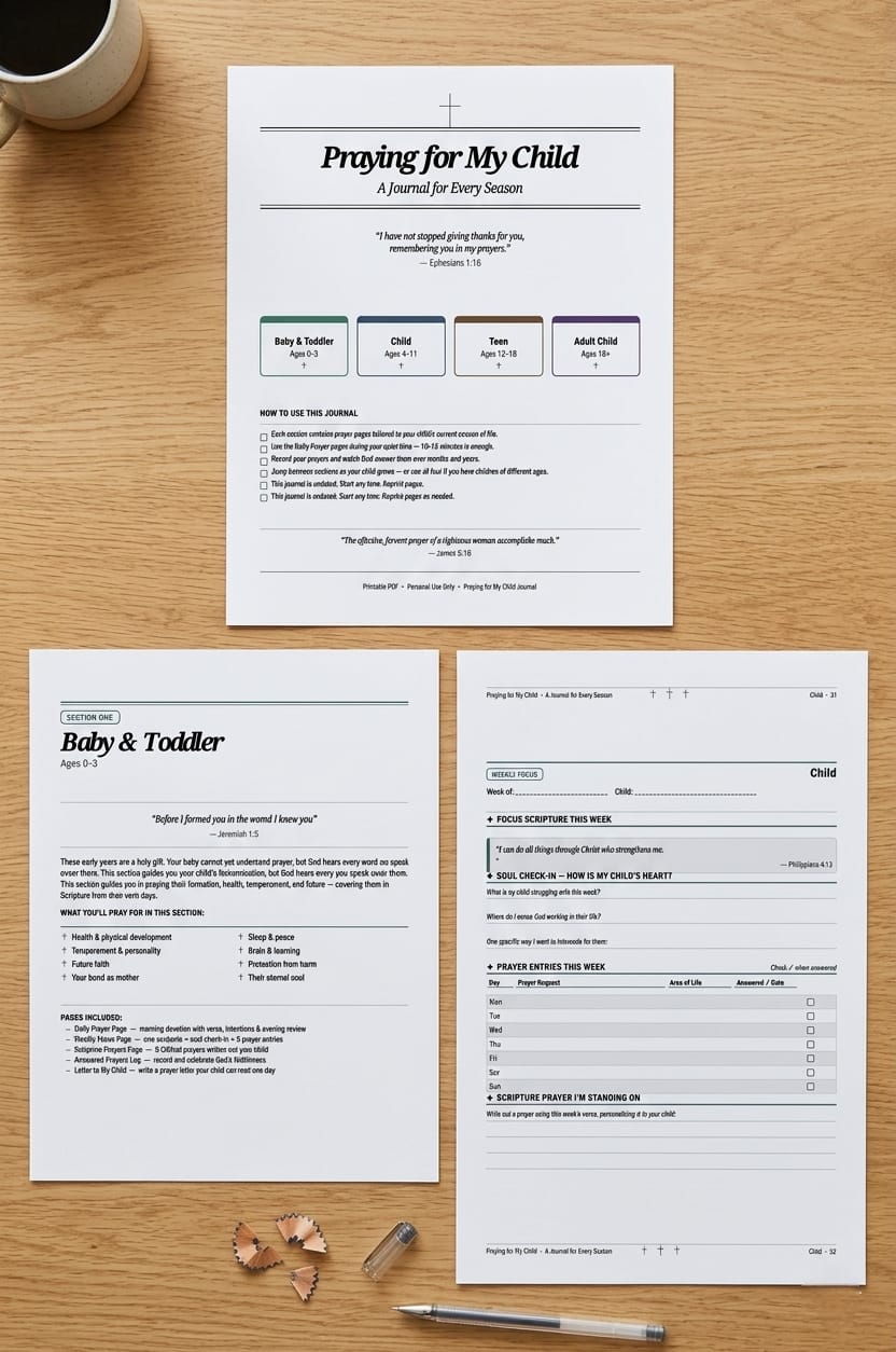The Praying for My Child Journal is a beautifully designed, print-at-home prayer journal for Christian moms who want to cover every season of their child’s life in intentional, Scripture-based prayer.