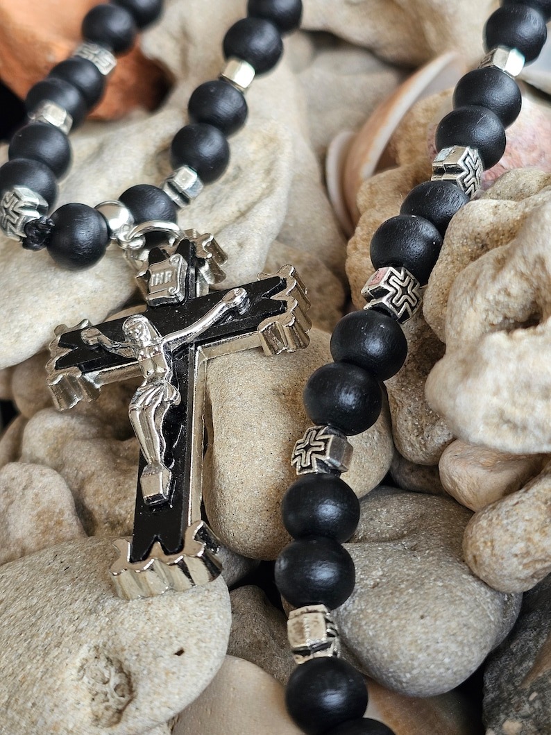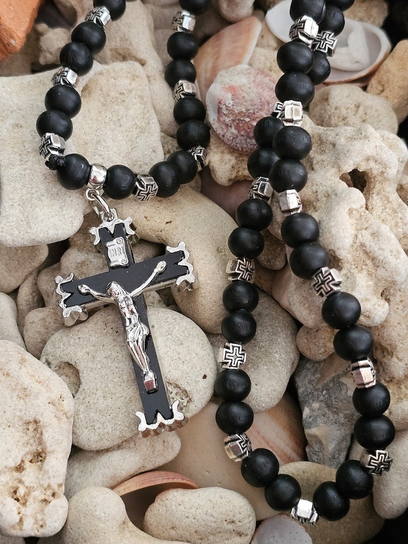 Elevate your spiritual journey with our exquisite 8mm wooden bead rosary. Crafted with precision, each bead exudes timeless elegance, while the metal cross beads add a touch of sophistication. The calming black color enhances the serenity of your prayers. Whether it’s a cherished gift for him or her, this rosary transcends traditional boundaries, symbolizing love, faith, and devotion. The intricately designed cross pendant serves as a powerful focal point, making it a perfect accessory for daily prayers or special occasions. Embrace the divine connection with this thoughtfully crafted rosary that seamlessly blends aesthetics with spiritual significance.
