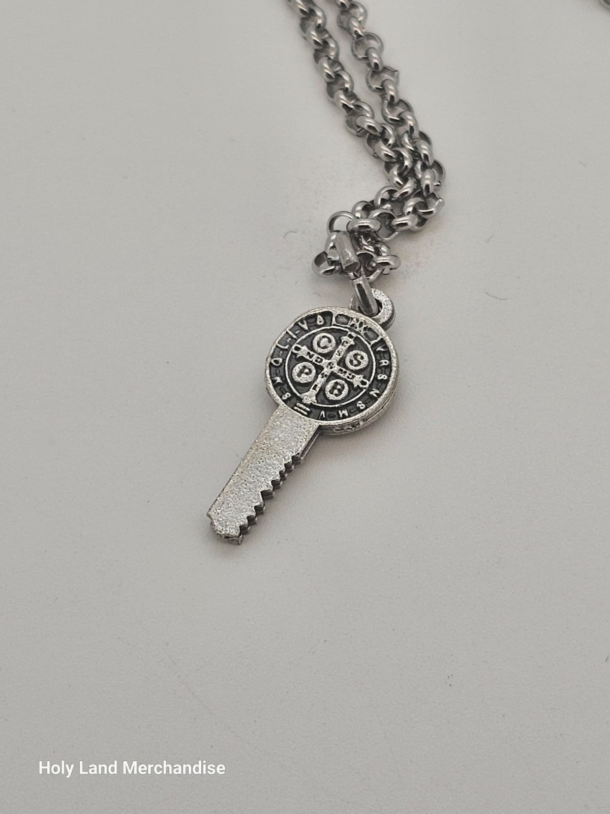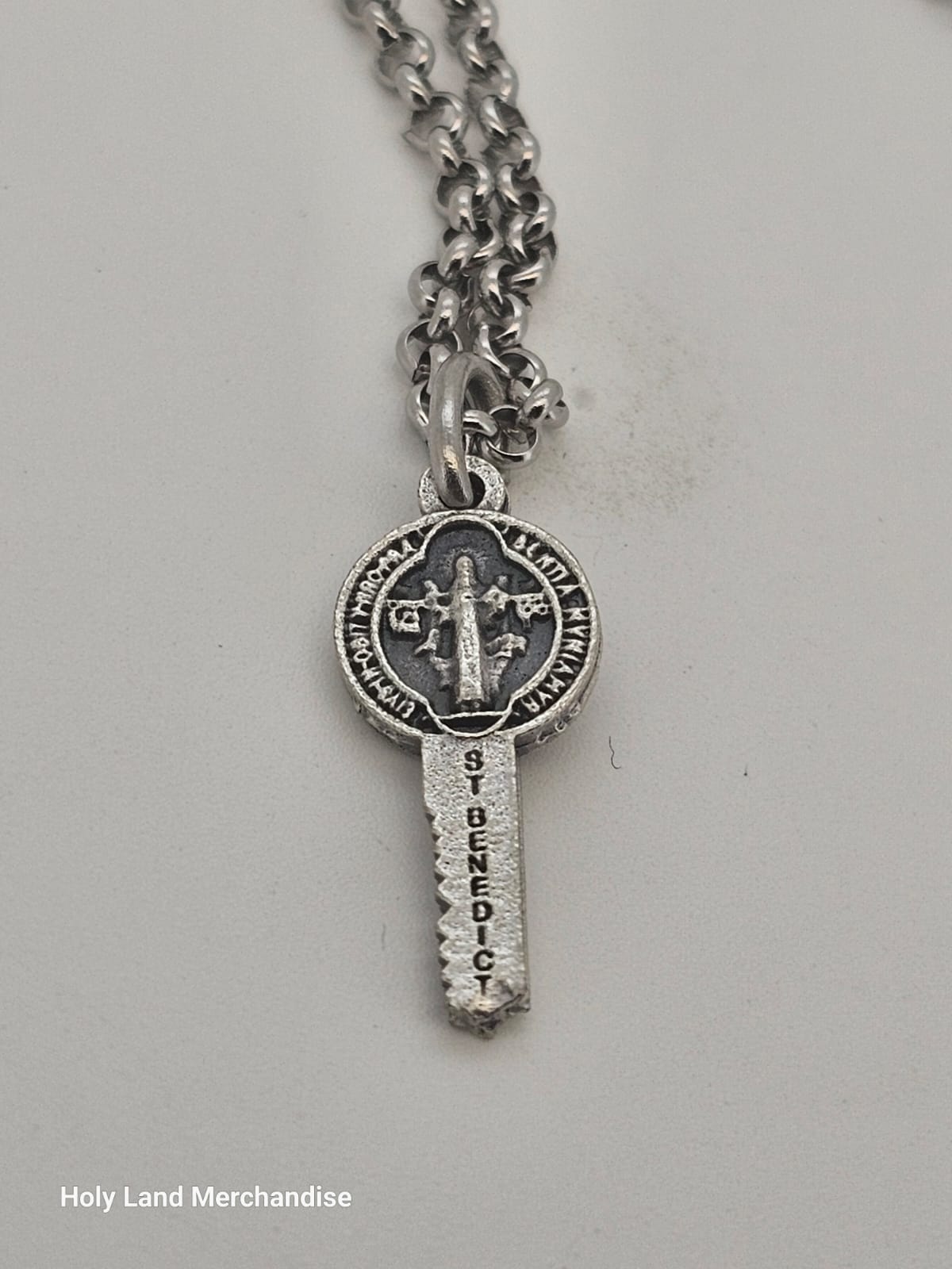 This Saint Benedict Key Necklace features a 1.5 cm key-shaped St. Benedict Medal on a 50 cm stainless-steel chain, making it a durable and spiritual accessory for everyday wear.