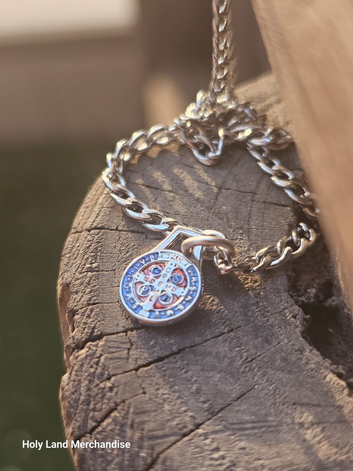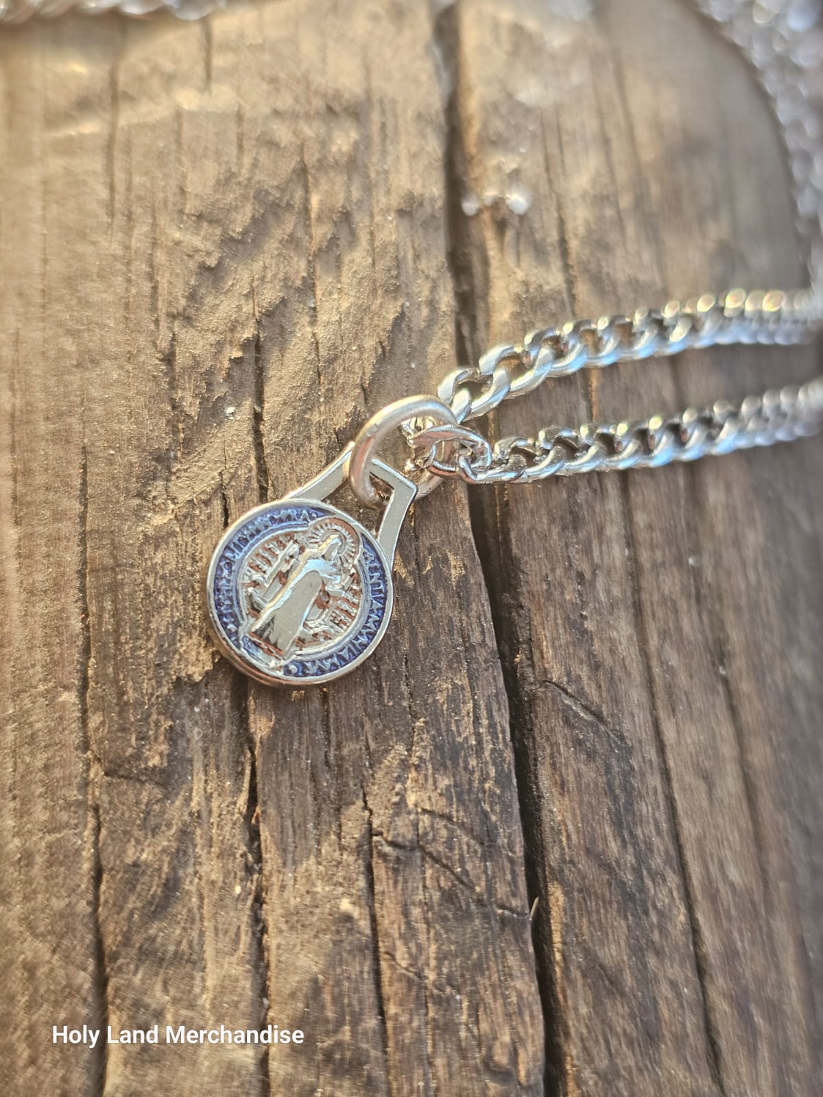 Saint Benedict Protection Medal Necklace – Silver Zamak with Blue Enamel (Mini 1cm Pendant) – Stainless Steel 50cm Chain