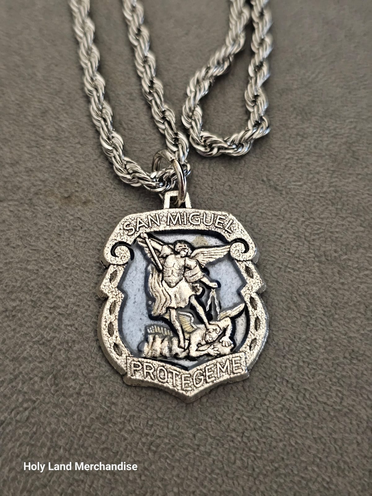 Front reads “SAN MIGUEL – PROTÉGEME” (“Saint Michael, protect me”)
