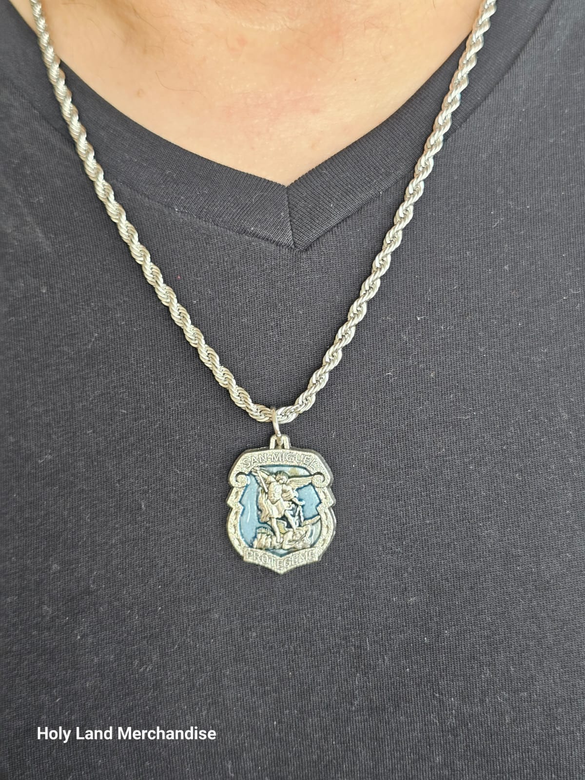 This necklace features Saint Michael the Archangel—“San Miguel”—stepping on the dragon, with the Spanish prayer “Protégeme” around the crest. Both the pendant and the twisted rope chain are crafted from durable stainless steel, making this piece hypoallergenic, sweat/water-resistant, and perfect for daily wear.