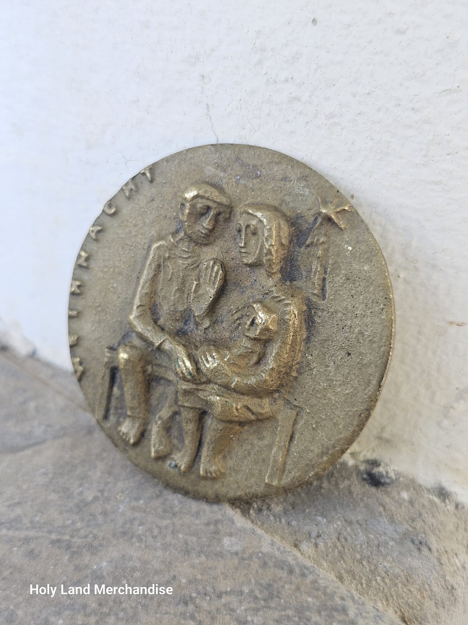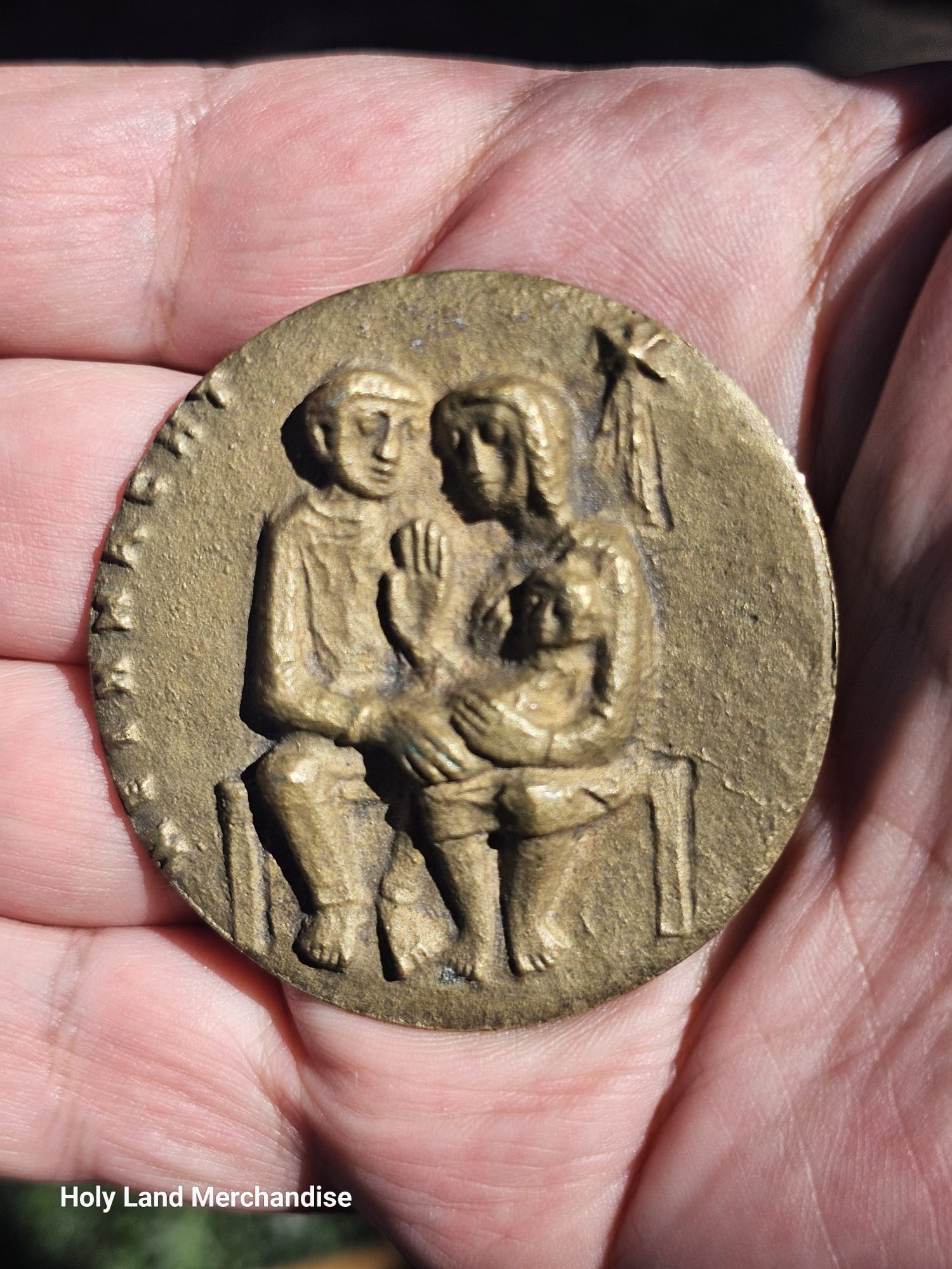 This vintage bronze commemorative medal was crafted in Germany in 1973, featuring a detailed relief of the Holy Family — Joseph and Mary seated with the Infant Jesus under the Star of Bethlehem.