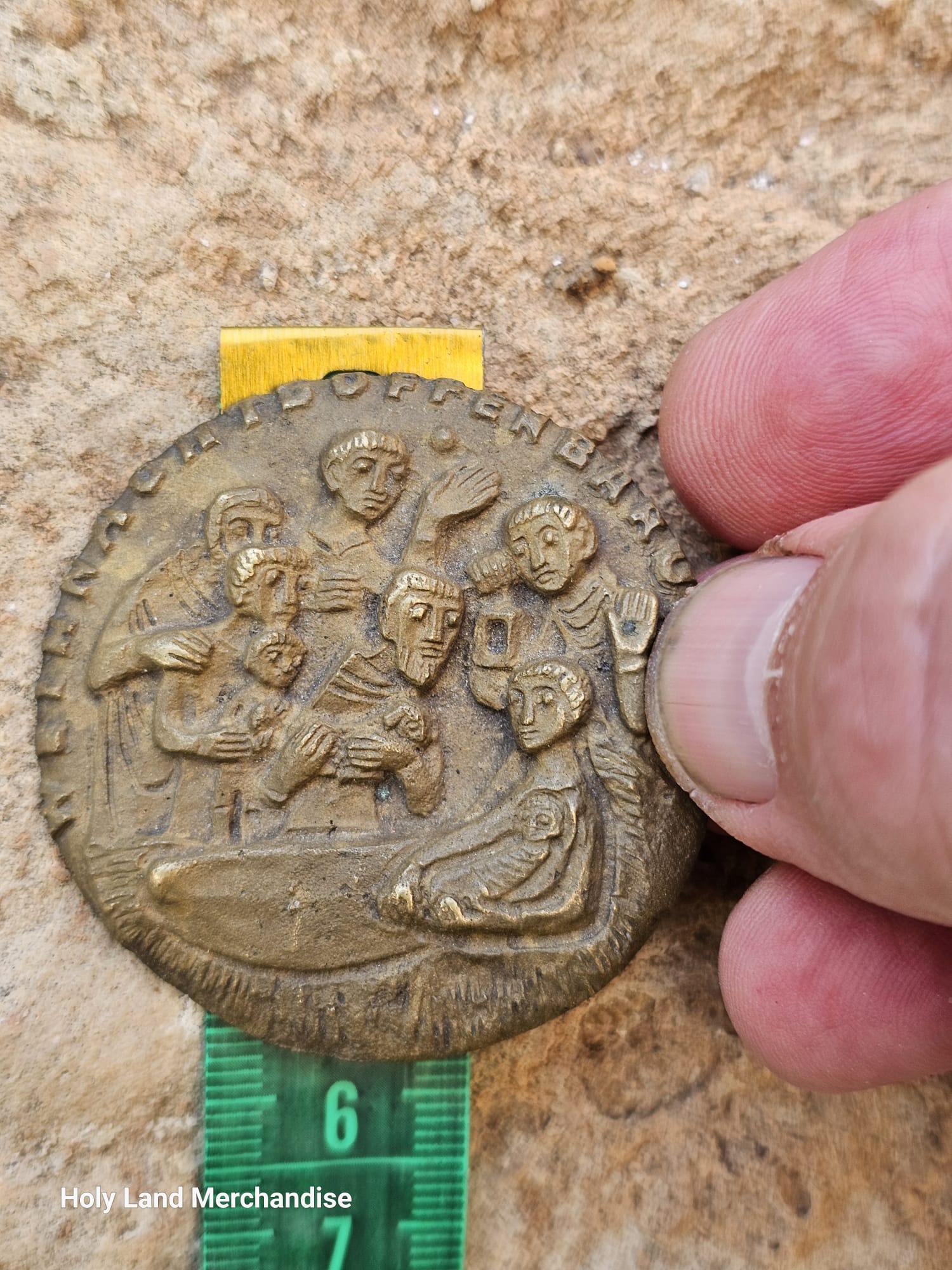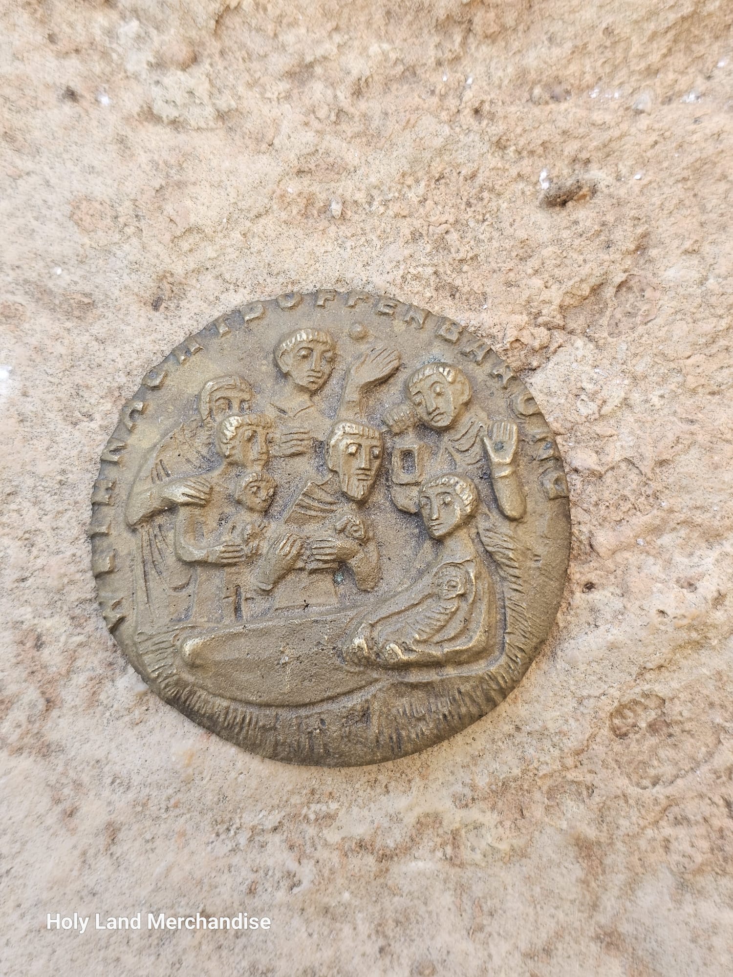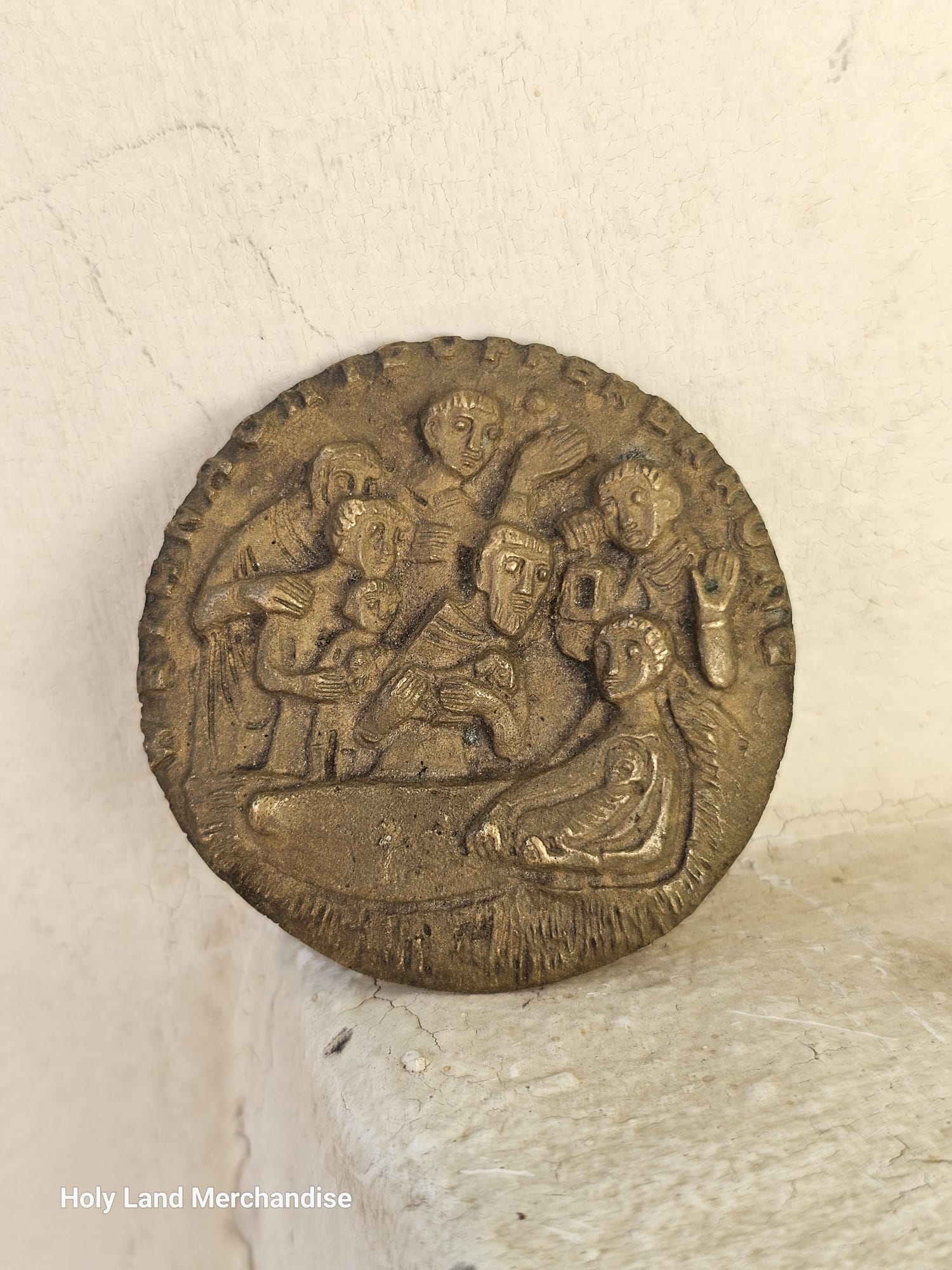 This vintage solid bronze medallion features a deeply carved biblical relief scene, depicting a group of figures gathered around a reclining or resting figure — possibly representing The Raising of Lazarus or The Lamentation of Christ.
