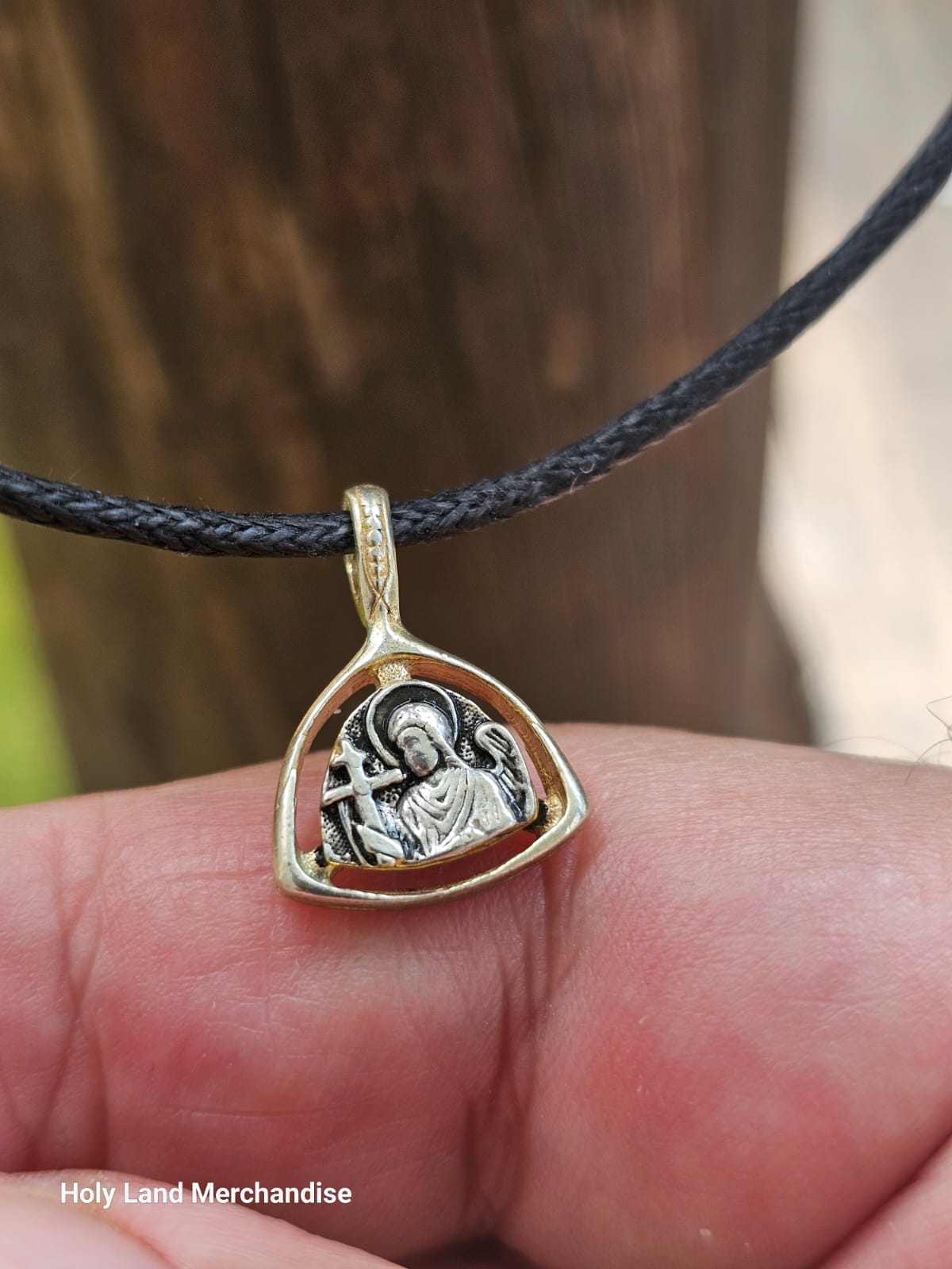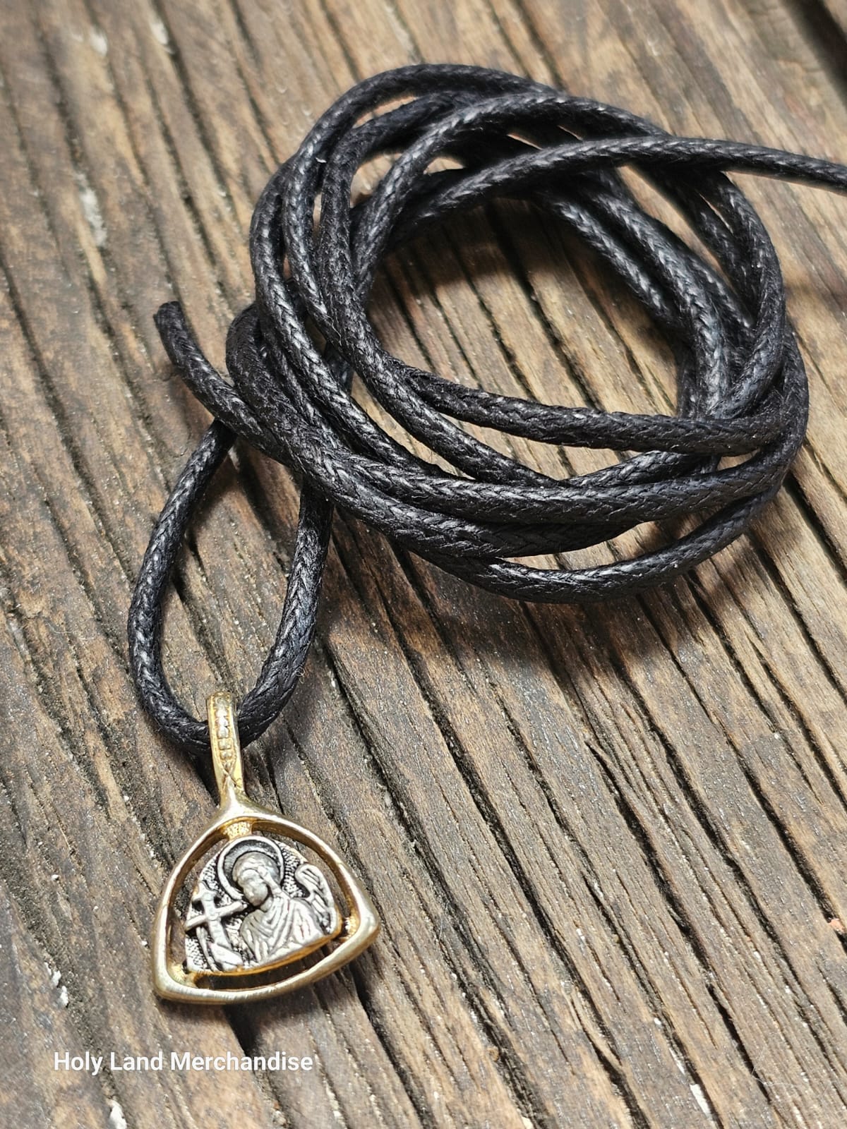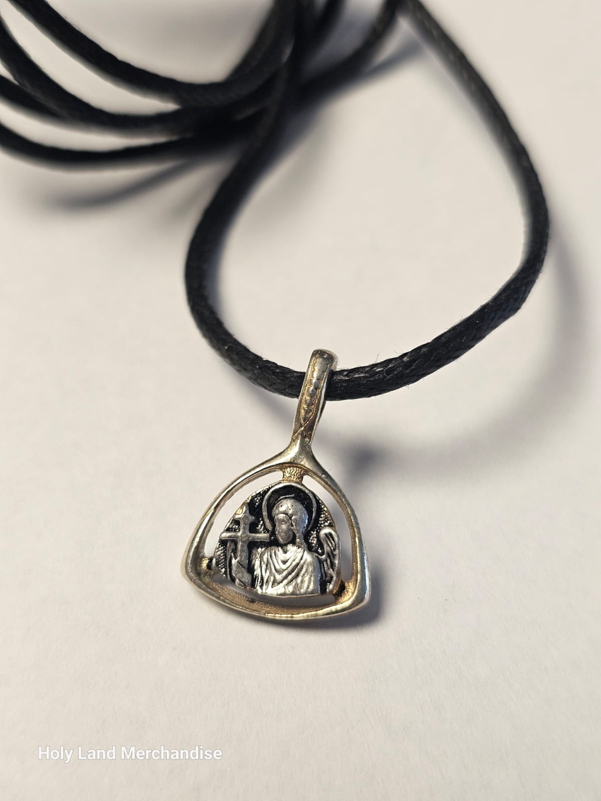 This small two-tone pendant is handmade in Georgia in the style of the Georgian/Orthodox tradition. An open, softly triangular frame in warm gold surrounds a finely detailed sterling-silver icon of a haloed angel holding a cross—commonly interpreted as Archangel Michael (protector & defender). The silver interior has a gentle antique patina that highlights the relief; the gold frame adds a subtle glow. Lightweight and comfortable for daily wear, it arrives strung on a black leather cord for a clean, unisex look.
