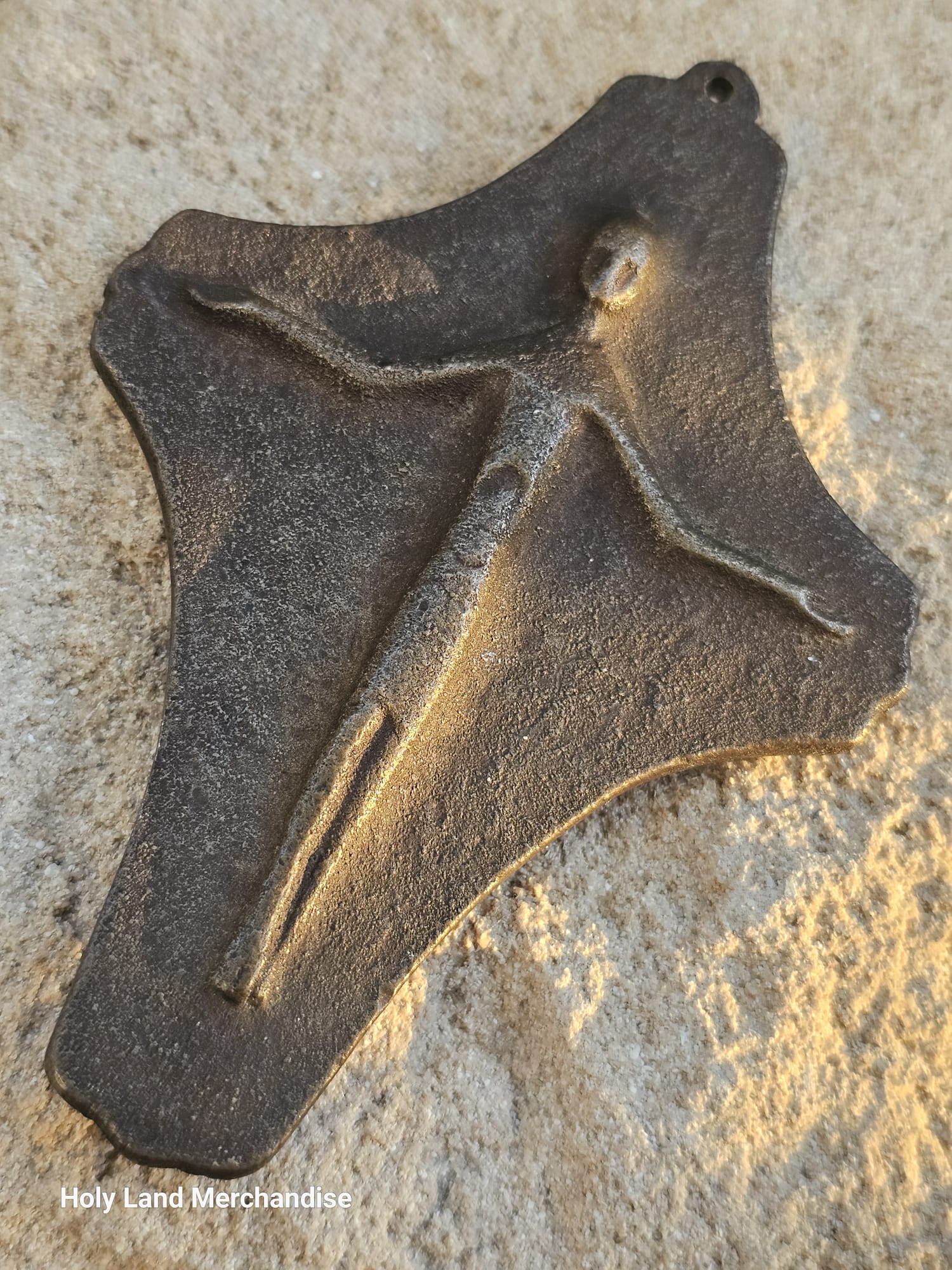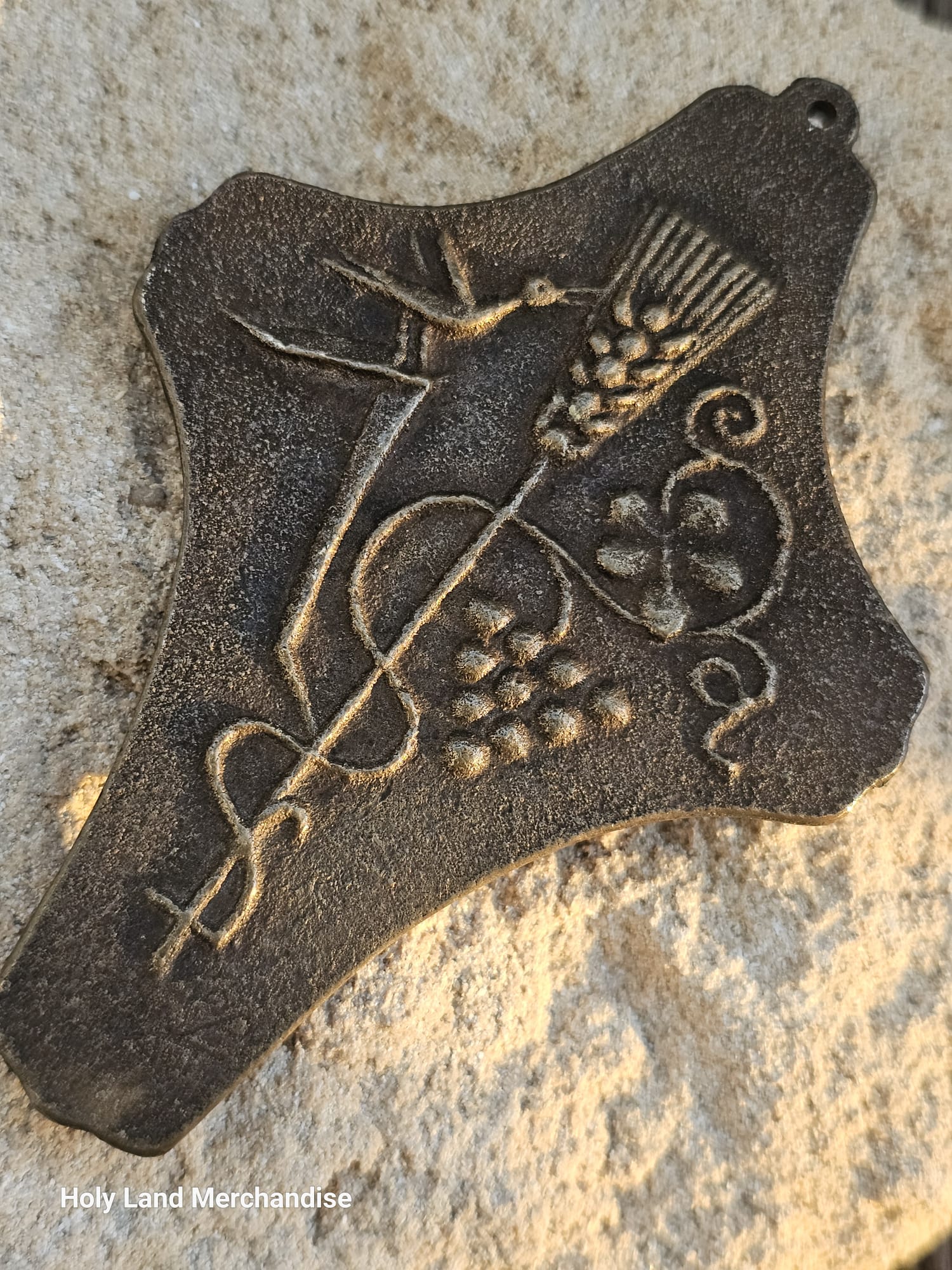 This heavy solid bronze wall plaque features an abstract figure of Christ on one side and Christian symbols — a dove, grapes, and a vine — on the reverse.